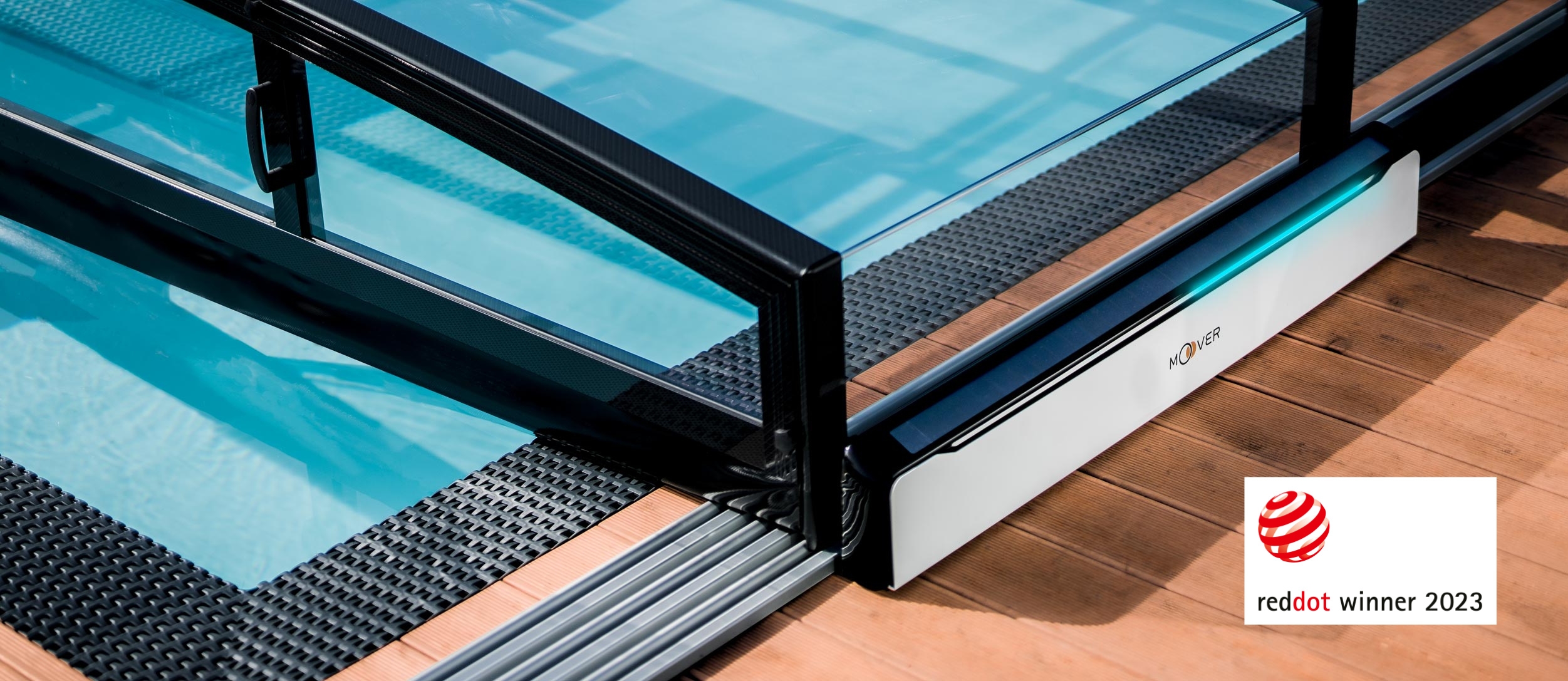 Schließlich verbessert eine elektrische Poolüberdachung auch das Erscheinungsbild Ihres Pools. Sie bietet ein schlankes und modernes Aussehen, das zu jedem Pool- oder Garten-Design passt. Der MOOVER wurde im Jahr 2023 mit dem Red Dot Award ausgezeichnet. Der Antrieb wurde für herausragendes Design und Funktionalität geehrt.