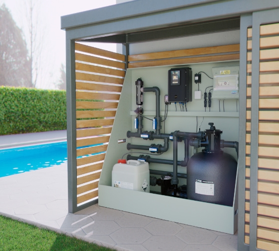 Wenn Sie Schwimmbecken und Pooltechnik kaufen möchten, bietet ALBIXON Ihnen die Option eines Komplettsets an. Während Wärmepumpe und Poolüberdachungen wetterfest sind und draußen bleiben, sollten die meisten der Technikkomponenten trocken und geschützt untergebracht werden. Stellmöglichkeiten bieten Garagen, Keller und Gartenhäuser oder eine umfunktionierte Fahrradabstellbox. ALBIXON bietet zwei sowohl ästhetische als auch lärmunterdrückende Varianten die Pooltechnik unterzubringen. Die Technikwand wird oberirdisch im oder am Gartenhaus installiert, der Technikschacht befindet sich in Poolnähe unter dem Bodenniveau.