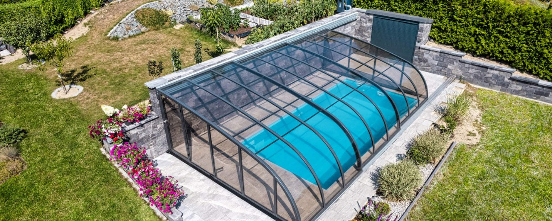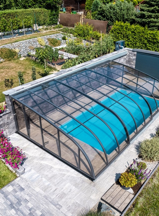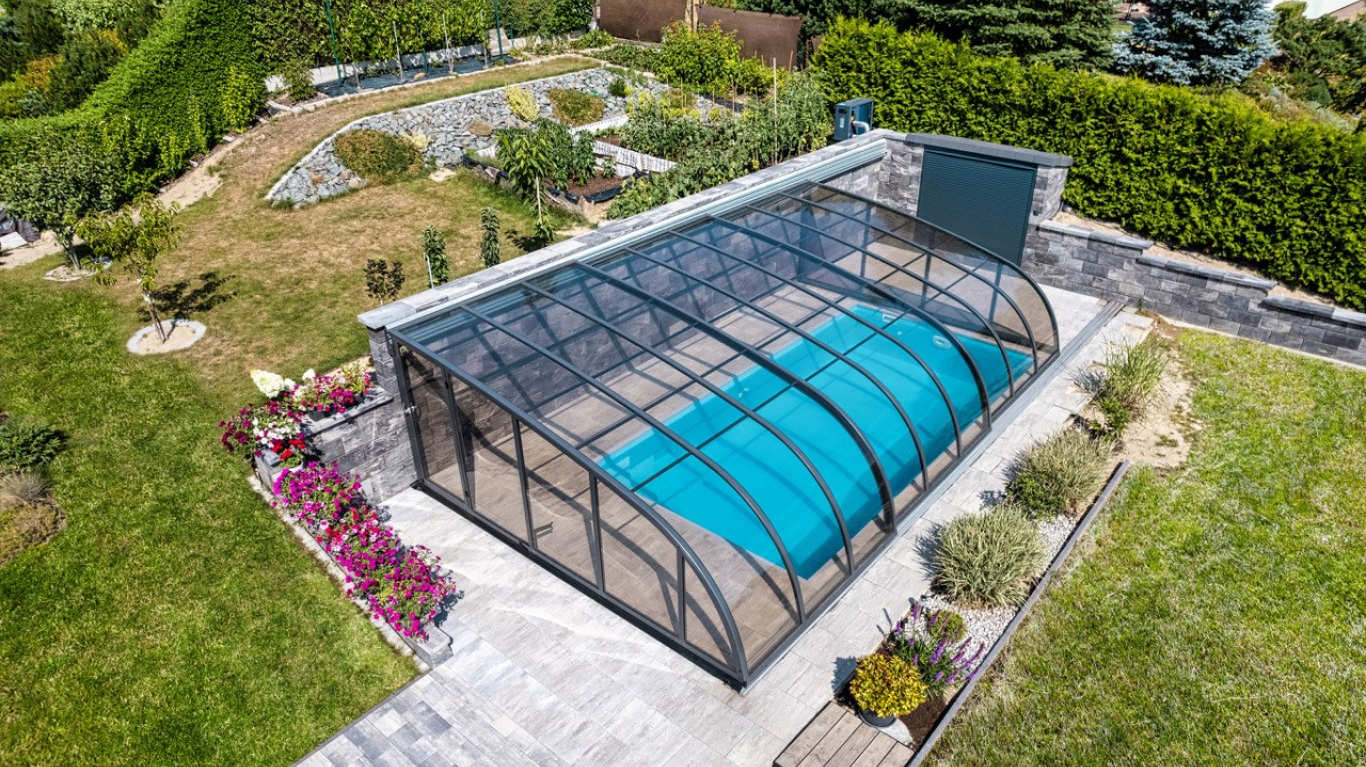 Wie überdacht man am besten einen Pool, der dicht an der Hauswand liegt? Die Lösung ist die maßgeschneiderte DALLAS an die wand Poolüberdachung, die Ihnen viel Platz auf kleinem Raum bietet.