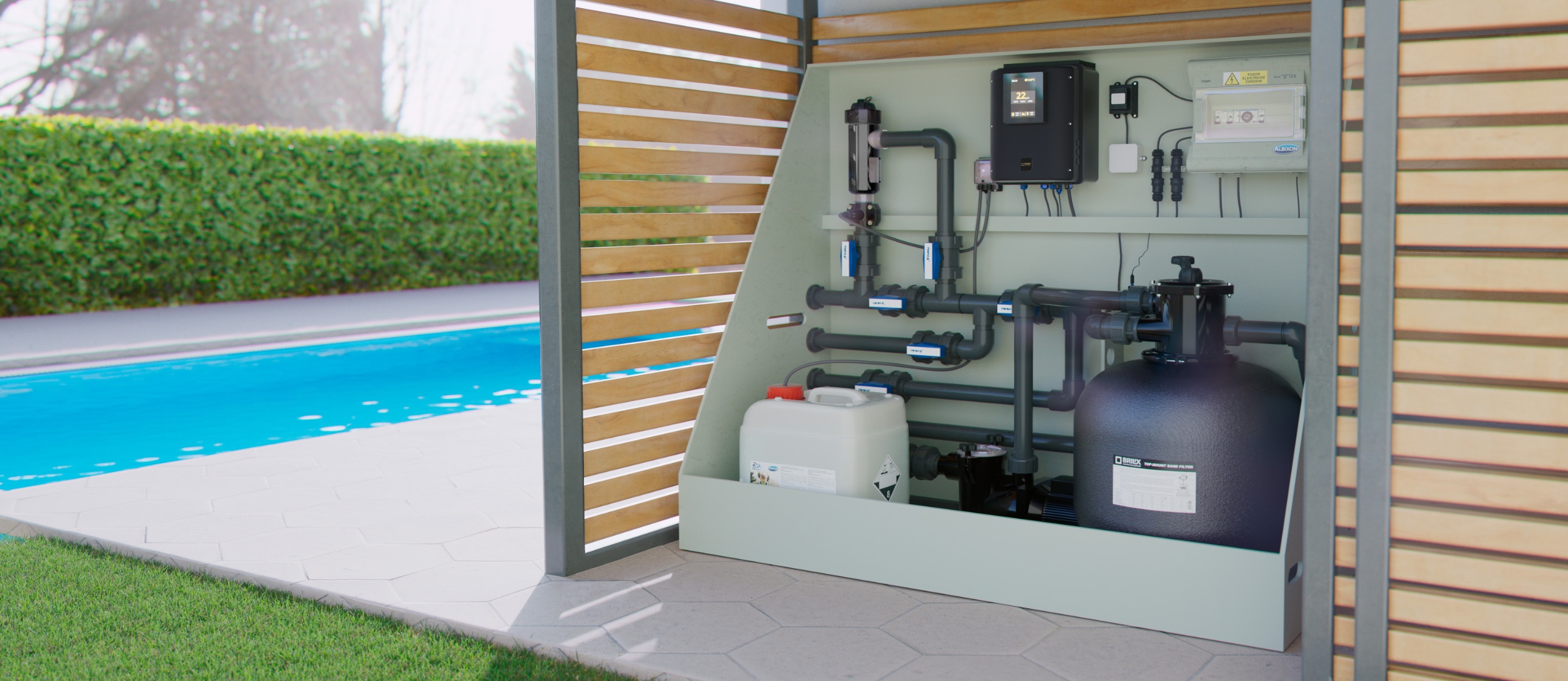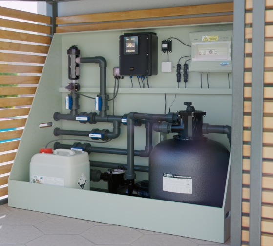 Das STATION-Dosiergerät ist die Lösung, wenn Salzwasser nicht verwendet werden kann, wie zum Beispiel in Innenpools.